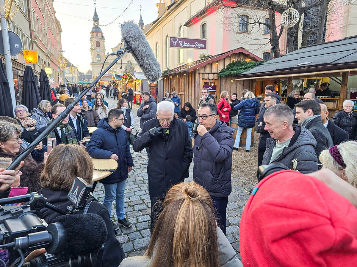 Das sieht die Eberhardstraße auch nicht alle Tage: Gegen 16 Uhr fährt eine schwarze Limousine vor, einparken ist hier nicht nötig. Erst sichern mehrere Männer mit schwarzem Anzug und Knopf im Ohr die Straße, dann entsteigt dem Mercedes ein großer Mann, sein weißes Haar im Meckischnitt: Winfried Kretschmann ist da. Er richtet Mantel und Schal, zieht sich seine Lederhandschuhe an, und dann kommt schon ein ganzer Tross auf ihn zu. Die Anwesenheit des SWR zeugt davon, dass es nicht ganz verborgen blieb, dass der grüne Ministerpräsident tatsächlich eine Stippvisite auf dem Ludwigsburger Weihnachtsmarkt macht, aber noch gestern Abend wurde sein Besuch gehandelt wie ein großes Geheimnis.